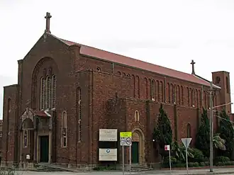 In 1934, the architects Fowell and McConnel won a design competition for a new Catholic Church at Bondi, judged by Leslie Wilkinson. The practice of Fowell and McConnel was established in 1927 when the pair entered a competition for the design of Tamworth War Memorial Town Hall for which they were awarded second place.[4] They were more successful in winning the competition for the BMA building in Sydney's Macquarie Street, which also eventually won them the first RIBA medal to be awarded in Australia.[5] Born in Australia but educated in England, Joseph Fowell (1891-1970) arrived back in Australia in 1919 where he taught under Leslie Wilkinson at the University of Sydney. The partnership went on to design a number of Catholic churches in Sydney and some New South Wales country towns. Kenneth McConnel left the practice in 1939 due to ill health. After World War II, McConnel formed a new partnership with Stanley Smith which was eventually to become McConnel Smith and Johnson.[4][1]