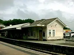 The main building is on the south side of the line, nearest the town centre and facing the bus station. It was built in 2001 to a design by Lacie Hickie Caley[16] and contains a booking office and shop. The wooden building on this platform dates from Great Western Railway days. The station car park is situated behind this platform. An accessible footbridge links the two platforms.