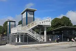 At the east end of the platform is a road bridge carrying Carlyon Road over the line and beyond this is a small cutting which is spanned by a footbridge. The original bridge survived for almost 150 years; it was extended when the extra line was laid in 1931 to the new goods yard, but both sections have now been replaced by Network Rail's prototype modular fibre reinforced polymer footbridge.[17]