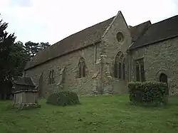 St Bartholomew's is constructed in stone rubble with tile roofs. Its plan consists of a nave and chancel built in the 12th century, a south aisle and a north chapel built in the 14th century, and a south porch of the 15th century. The south aisle is in three bays between which are stepped buttresses. The middle bay contains a pair of lancet windows. In the easternmost of the bays has a two-light window, and in the western bay is the south doorway. The porch is arched, and in each side of it are two-light windows. The west window of the aisle consists of two lancets, and at the east end is a three-light window. The west window of the nave has four lights. On the north wall are two buttresses, and it contains two 12th-century round-headed windows, one of which is partly obscured by a buttress. The chapel has a four-light north window, and three-light windows on the east and west sides. The south wall of the chancel is in three bays. It contains a priest's door, with a two-light window on each side. The east window has four lights, and below it are a two-light mullioned window and the head of a doorway leading to a vault.[1] The churchyard contains the war grave of a soldier of the Army Service Corps of World War I.[5]