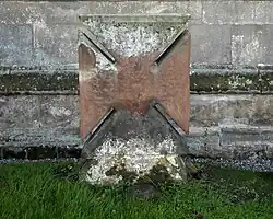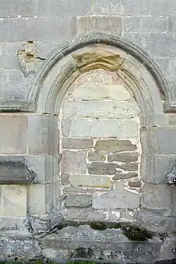In addition to the college of priests, the income of the foundation was for the support of thirteen disabled poor men[25] (tresdecem pauperum debilium).[24] At the same time, Dame Isabel had almshouses built at the western end of the church that would house 13 people.[32] The almshouses (also known variously as the hospital) were abandoned and rebuilt off-site in Tong village in the late 18th century.[33] The derelict almshouses were destroyed in the 19th century by the then owner of the Tong estate, Mr George Durant. Only one of the outside walls is left standing today[34] which is grade II listed.[35]