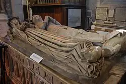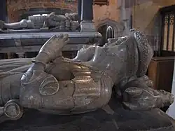 A new church building seems to have been erected in 1260.[12] By this time the male line of the la Zouche family at Tong had petered out and the manor was being passed through the descendants of Roger's daughter, Alice.[13] Her daughter Orabil married Henry de Penbrigg and in 1271 the couple were granted a charter by Henry III at Winchester, allowing them to hold a weekly market at Tong on Thursdays, as well as an annual fair stretching from the eve to the morrow of St Bartholomew the Apostle (23–25 August).[14] Henry's father, also Henry, had recently died, after losing the family's patrimony of Pembridge in Herefordshire as a result of his participation in the Second Barons' War.[15] Hence, his main manor was now Tong and his successors were generally described as Pembrugge or Pembridge of Tong Castle. The last of these was Sir Fulk Pembridge, a very substantial landowner who was a member of the Parliament of England for Shropshire just once, in 1397. The History of Parliament avers that "Pembridge's status as a wealthy landowner is not reflected in his public service." He died in 1409 sine prole (without issue), despite two marriages.[16] Sir Fulk had greatly expanded his lands and wealth through his first marriage to Margaret Trussell, only 14 years old when her father died in 1363 but already a widow. Margaret died in 1399. Sir Fulk's second wife, Isabel Lingen, who had been married twice before, was to survive him by 37 years. She was from the Herefordshire landed gentry, the daughter of Sir Ralph Lingen, of Wigmore, according to the History of Parliament. The inquisition for the feudal aid levied by Edward III in 1346 found a Radulphus de Lingayn holding the manors of Aymestrey and Lower Lye,[17] close to both Lingen and Wigmore in Herefordshire: both estates belonged to the honour of Radnor and were within the large tracts of the Welsh Marches dominated by the Mortimer family of Wigmore Castle. Isabel had Tong and a large portfolio of Trussell estates settled on her for life, which was to lead to prolonged and bitter conflict between the Trussell family and Sir Fulk's heir, Richard Vernon of Haddon Hall.[18]