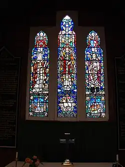 The puriri block foundations was replaced with concrete in 1953.[2] A neighbouring property was purchased in 1956 to serve as a Sunday school and church hall.[1]: 44 In 1961 a stained-glass window, created by Whitefriars Stained Glass Studio, was installed for the centenary. The left window shows Saint Bride with St Bride's Church, Fleet Street, shown below. The middle window shows Jesus Christ, with the Moravian Church seal shown below. The right window shows Bishop Selwyn and below it St Bride's Church, Mauku, with the stockade around it. The windows cost £600.[5]: 12