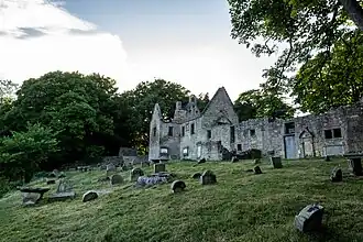 The ruins are maintained by Historic Environment Scotland. The loft can still be accessed, and the church's piscina survives in good condition. The church has three distinct aisles adjacent to the main room: the large Dunfermline Aisle to the west, built around 1610, contains a burial vault for the Earls of Dunfermline,[2] and Alexander Seton, 1st Earl of Dunfermline is buried here. The Fordell Aisle to the north is a late 16th-century addition, and the small Inglis Aisle next to it dates from the early 17th century.[3] An open-air service is held at the church every year in June. Several carved gravestones remain in the old churchyard, some from as early as 1665. A 'keep' is built into the churchyard wall, providing a place from which the church beadles could guard against body-snatchers.
