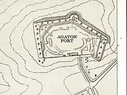 Part of the north-eastern defences of Plymouth, work on Agaton Fort started in 1863 on a hill near the hamlet of Agaton, in the parish of St Budeaux. It is a five-sided polygonal fort, and was designed to mount fifteen 7-inch guns which could mutually support the neighbouring Ernesettle Fort and Knowle Battery. The initial contractor failed in 1866 and the work was completed in 1871 by Royal Engineers. Only three of the 7-inch guns were ever mounted, along with five 64-pounder guns for close defence. It was also protected by a dry ditch and three caponiers. The fort was disarmed in the 1890s, but continued in military use through both World Wars.[6] It is now a VOSA Test Station and is a Scheduled monument.[7]