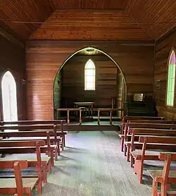 St. Clement's Church is a small weatherboard building of Gothic architecture style, topped with a tin roof. Architecturally, it is representative of the small, rural churches common throughout Australia in the early 20th century. The church's construction includes Baltic pine for the weatherboards and ceiling, jarrah for the floorboards, cedar (Toona ciliata) for the interior walls, and walnut (Juglans) for the altar rail. While Baltic pine remains accessible, jarrah, cedar, and walnut are now considered rare and costly, adding to the historical value of the building's materials.[10][11] The structure is divided into four main areas: the narthex (entryway), nave, chancel, and vestry (sacristy), and features distinctive stained glass windows in pink and green.