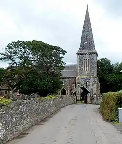 The nineteenth century church was built from the designs of architect Charles Nelson, with construction beginning in 1840.[1] The walls were built with limestone rubble and the tower was constructed using oolite sedimentary rock for the pyramidal broach spire.[1] Local tradition claims that finial on the spire was cut from one of the stone supports of the cross which stood near the entrance to the old Friary in Lammas Street, in the nearby town of Carmarthen, and that it had been attached to the stake where the Protestant Bishop Robert Ferrar was martyred, burnt to death on 30 March 1555, a victim of the Marian persecutions during the reign of Queen Mary I.[2] It was believed that the stone had lain for years in the yard of a local pub, before it was retrieved by historian Connop Thirlwall when he was Bishop of St Davids, and cut to be the finial.[1]