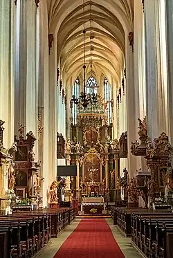 In 1350 the church was taken over by the Franciscan order expelled from the Church of St. Vincent. However, the number of brothers continued to dwindle rapidly due to the Reformation and already by 20 October 1534 they had left the building. It was not until October 15, 1561, that Emperor Ferdinand I allowed the deconsecration of the building and their temporary use for storage. Subsequent plains to bring in the Jesuits were unsuccessful, and in 1613 Emperor Matthias returned the building to the Franciscan Order, who took over the buildings on February 6, 1615. In 1686, the interior was rebuilt in an ornate Baroque style, as was the monastery building. In 1707 the church was made a parish church.