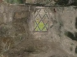 The eastern room on the ground floor of the medieval building is now called The Oratory. This is agreed to be the first element to be constructed and to have functioned as a church. It is aligned east–west and the altar according to church practice would have been at the eastern end. There are no architectural features that would suggest any screen that might have existed between a nave and a chancel. The principal window in the south wall of the Oratory has been dated by Harbison at 1230 AD. There is a taller window with a pointed arch behind the altar position on the east wall, possibly dating from the same time. There is a fragment of a piscina, for washing hands and vessels. A very narrow splayed window by the southeast corner, beside the altar position is said to have been a viewing hole for lepers, who were not allowed in the church. In the west wall of the Oratory is a hole said to have been used as a cure for ailments. In the west wall are evidence of blocked-up arches, said to have led at one stage to an aisle, now gone, which was built to accommodate congregation overflow. There is clear evidence of a blocked-up door in the south wall of the Oratory. There is a recess near the altar, possibly for vessels and other ceremonial items.