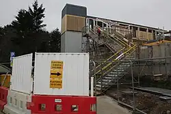 A replacement footbridge with lifts is being installed to enable step-free access to the whole station. The work was due to be completed in spring 2024,[15] but was later pushed back to the end of 2024.[16] The original footbridge was dismantled in October 2024 and donated to the East Somerset Railway; they plan to install it at Cranmore railway station by the end of 2025.[17] The span of the new footbridge, which weighed 50 tonnes (50,000 kg), was lifted into place by a 1,000-tonne (1,000,000 kg) crane in October 2024, with temporary staircases being used until permanent staircases are erected.[17] The project provoked discussion: it was supported by local MP Derek Thomas and Connor Donnithorne, the cabinet member responsible for transport at Cornwall Council, while some residents opposed the plans.[16] One local historian said that the station would be "losing a valuable asset", replaced by a poorly-designed "eyesore".[18]