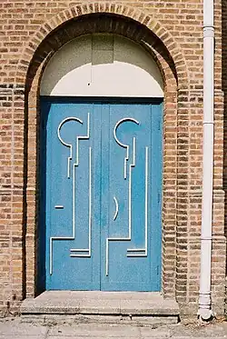 In 1976, a pair of controversial[12] stained glass windows, by the artist Brian Clarke,[13] were installed into St Gabriel's. Commissioned to design stained glass for the baptistery,[7] Clarke, then twenty-four years old, produced working studies for the slender, arched fenestration, fabricating and installing the windows himself in 1977. In 1978, Clarke and the restoration of St Gabriel's were the subject of the cover story of the journal Architectural Review[14] with an artwork titled Velarde is Not Mocked.[12] The windows, as part of the restoration, were designed in direct response to the architecture, making reference to elements of the original design of the building. Significant changes were made by the restoring architect to the building, and the interior and exterior elements were unsympathetically altered.[12] Clarke's public attack on the treatment of Velarde's architecture by the restoring firm marked the end of his working in the Church of England.