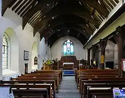The church dates from 1282; a second nave was added about 1450.[3] Much of the church was rebuilt in 1736. Around that time, Edward Whetnall, a carpenter from Wrexham, replaced the stone arcade between the two naves with an arcade in timber. In 1759 a gallery was built at the west end of the south nave, and it was extended in 1781. It is likely that the porch was enlarged in 1774. In 1870 the church was restored by John Douglas, adding some Gothic-style windows and bracing to the colonnade. The box pews were also removed, and it is likely that the gallery was removed at this time. There were further restorations in 1906, in the late 1920s, and in the 1970s.[4]