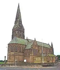 Looking over the North Sea, beacon-like, it was designed by the church architect John Loughborough Pearson and built in 1884 by the 6th Duke of Northumberland. The church, in particular its impressive spire of 180 feet,[1] was used as a navigational aid by the fishermen of Cullercoats as well as by major shipping approaching Tynemouth in times gone by. Restoration work on this church has included the replacing of dangerously corroding stonework, roof repairs[2] and the cleaning of some of the stained glass. The church is a Grade I listed building.[3][4]