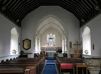 In a survey recorded in 1751, two bells were noted in the west end and the nave and chancel were thatched.[3] The present single bell, marked "chapel of Ely house, London", is dated 1769. The 19th-century roof is of collar rafter type. The two centred chancel arch, 19th century, have two moulded orders, the inner on engaged colonnettes.[6] The 1980 vestry conversion included toilet, refreshment facilities and improved access for the disabled.[12]
