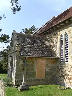 More changes took place in the early 14th century, by which time English Gothic architecture had moved into its Decorated Gothic phase.[9] A new wider chancel arch was installed between the crossing and the chancel, a side chapel was added on the north side, new windows were added in the nave, and the original rounded west arch of the crossing (into the nave) was replaced by a new pointed arch.[6][7][9][14][16][17] The side chapel probably replaced the old north transept, which was removed "for some reason unknown";[14] its roofline can still be traced.[7] All of this work apparently took place between 1320 and 1330.[14] One contemporary feature that has now disappeared was a chantry chapel dedicated to Marie de Bradehurst. It was built alongside the chancel and was latterly used as a schoolroom until it was removed in the Victorian era.[17] The dedication relates to the Broadhurst manor in Horsted Keynes parish. The demolition of the chapel revealed the outline of a wide blocked pointed arch on the south wall, which is still clearly visible.[18]