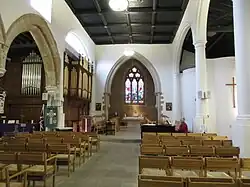 The entrance from the west tower has a round-arched doorway leading into a vestibule with two flights of stairs. A pointed-arched doorway separated the vestibule from the nave and lesser doors lead to the north and south aisles. The nave has a six-bayed south arcade with Doric columns decorated with lion masks. There is a pointed arch in front of the sanctuary with a stone rederos and the east window designed by C.E. Kempe installed in 1879. It depicts the Crucifixion, the Resurrection and the Assention. The west wall is decorated with the coat of arms of George I of Great Britain.