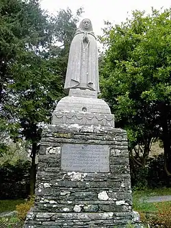 The site contains a life-sized limestone statue of Saint Gobnait commissioned by locals from the Irish sculptor Seamus Murphy. It was completed in 1951 and unveiled that year on Whit Sunday.[8][9][10] Murphy was one of the best known Irish sculptors at the time, and his design is renowned for its "simplicity and beauty".[8] Gobnait is shown standing on a pedestal, under which is a beehive. The sides of the pedestal are lined with carvings of bees and stags, reflecting her legend, while a set of independent rosary beads hangs from her neck.[8]