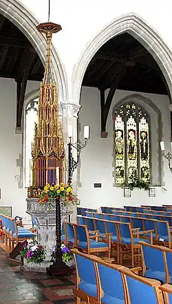 The exceptionally tall and elaborate font cover,[16] dating from the 15th century, was described by Nikolaus Pevsner as "One of the finest medieval font covers in the country".[3] The lowest section of the 12-foot (3.7 m) tall cover was adapted in the 19th century to telescope upwards, so as to avoid having to lift the whole edifice in order to use the font.[17] The choir stalls have carved heads on the arm rests and misericords under the seats. Two panels from the former rood screen have been incorporated into the stall backs, but were over-painted during the Victorian restoration; an unrestored panel displayed at the west end of the church, depicts the legend of John Schorne, the Rector of North Marston, conjuring the Devil into a boot.[3]