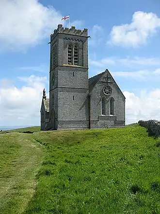 The site was originally just a burial ground with memorial stones dating from between the 5th and 8th centuries.[3] The church was started in 1244 as 'The Church of the island' but with no official name (Calendar of Liberate Rolls, 15.04.1244).[4] A single reference to the site is known to exist as "Church of St Mary" in 1254.[4] A small chapel on the island, probably founded in the 12th or 13th century, was dedicated to Saint Elena;[4] it fell into disrepair by the 17th century. A temporary corrugated iron structure was dedicated to Saint Helen in 1885.[5] The present square-towered stone church was built in the mid-1890s by the Reverend Hudson Grosett Heaven, financed by an 1895 bequest from Sarah Langworthy, born Sarah Heaven, of the Heaven family which owned Lundy from 1834 to 1918. The church was designed by eminent Victorian architect John Norton, completed in 1896 and consecrated on 17 June 1897 by Edward Bickersteth, the Bishop of Exeter.[5]