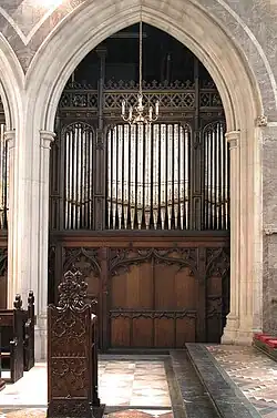 The organ was built by William Hill & Sons and installed in 1882. The instrument has been rebuilt and revoiced several times in its history; originally the organ was built with three manuals, and in 1908 a fourth manual, the Solo, was added during enlargement work by Hele & Co of Plymouth. It was then rebuilt in 1936 by Rushworth and Dreaper of Liverpool, and again in 1972 by J. W. Walker & Sons Ltd.[16]