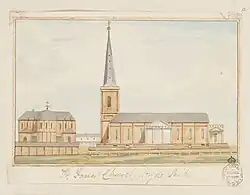 "The reason for Bigge's change of mind may be found in the appointment, three years later, of his brother-in-law [and secretary], Mr TH Scott, a wine merchant, as Archdeacon".[14] The design of the courthouse was modified before construction with the addition of a steeple at the western end, to serve as a church, while the adjacent school buildings were put into use as a courthouse.[10] The first service was held in the unfinished church on the Day of Epiphany, 6 January 1822, the text being from Isaiah, Chapter 60: "Arise! Shine, for thy light has come. The glory of the Lord has risen upon thee". It was anticipated in the Sydney Gazette's report of the event that the church, when fitted out with stalls and galleries, would hold 2,000 people.[11] The church was consecrated by the senior chaplain, Samuel Marsden, on 11 February 1824.[10][1]
