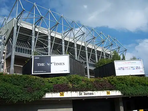St James is a Tyne and Wear Metro station, serving St James' Park, Newcastle upon Tyne in Tyne and Wear, England. It joined the network as a terminus station on 14 November 1982, following the opening of the fourth phase of the network, between Tynemouth and St James via Wallsend.