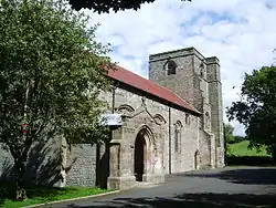 The church is constructed in sandstone rubble, and it has a roof of red tiles. Its plan consists of a nave with a clerestory on the north side only, a north aisle, a south porch, a tower at the crossing with a north transept and vestry, and a chancel. In the south wall of the nave are three windows of three and two lights under segmental heads containing Perpendicular tracery. To the west of the windows is a porch with a doorway under a pointed arch, and a gable surmounted by a cross finial. To the right of the three windows is a smaller two-light window at a higher level, and a doorway. The windows in the north wall of the aisle have two or three lights under flat heads, and the clerestory windows have two lights with elliptical heads under flat lintels. The tower has buttresses on the north and south sides, and a square stair turret on the south side. Also on the south side, in the middle stage, is a window with a pointed head. In the top stage the bell openings have two lights, and on the summit of the tower is a plain coping. In the south wall of the chancel is a two-light window with a segmental head. The east window has five lights.[2] Its tracery is in a mixture of Perpendicular and Decorated styles.[3]