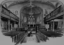The roof collapsed in 1924 and was rebuilt by 1926.[14] Among people who were commemorated in the church windows were John Owens, and Sir Thomas Bazley.[12] Another window was of some antiquity, originating from a convent in Rouen, France, and presented to the church by a grateful French refugee priest.[4] This Entry to Jerusalem window was moved in 1929 to the Church of St Mary the Virgin, Eccles and windows depicting St John, St Peter and St Matthew, dating from 1760 by William Peckitt, were at some time moved to St Ann's Church in the city.[15]
