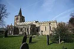 The church is built of sandstone; the chancel with rubble, and other parts with coursed stone. The roofs are a mixture of lead and copper. The nave has north and south aisles, a south porch, and a clerestory on the north side. The tower is at the west end, with a two-light west window, buttresses, gargoyles, a parapet, and an octagonal spire. The chancel has a priest's door, several lancet windows, and one three-light window, in addition to the 19th century polygonal apse.[1]