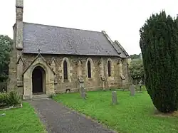 The church is built in split cobbles, with stone dressings and a purple slate roof. It consists of a four-bay nave, a south porch, and a single-bay chancel, with a bellcote on the west gable. The porch is gabled and has an arched entrance with a chamfered surround. The inner door is noted for its elaborate hinges. The windows on the sides are lancets alternating with stepped buttresses, at the east end are three lancets. Inside, there are boards displaying the Ten Commandments, 20th-century furnishings, and a timber roof.[2]