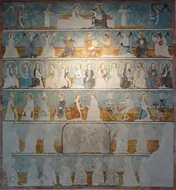 In much better shape than the lowest two bands of this mural are those of Saint Catherine of Alexandria and of a virgin (or the Virgin) with a unicorn.