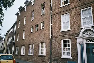 The college is formed from a number of Georgian houses on the Bailey between Durham Cathedral and the River Wear. The main house is Haughton House, named after Haughton Castle in Northumberland, the seat of the family of William Donaldson Cruddas who were early benefactors of the college and other Christian churches and charities in the north east of England.[7][8] The houses which make up Cranmer Hall were once owned by the Bowes-Lyon family (the late Queen Elizabeth The Queen Mother's family). The majority of the college buildings are grade II listed, with parts of 3 and 4 South Bailey grade II* listed.[9] Before coming into the possession of St John's, Linton House, no 1 South Bailey, was the main property of St. Chad's College. It is said to have much earlier origins, with the frontage seen today added to an existing timber-framed building after the Restoration of the Monarchy in 1660.