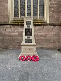Perth's first dedicated war memorial was unveiled in St John Street, at the rear of the church, in 2021. Prior remembrance services were carried out at the Perth mercat cross, between Perth City Hall and St John's Shopping Centre, which was perceived to be "an insult" to veterans.[8][9]