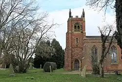 The church is built of red brick with stone dressings and a tile roof. It consists of a nave, a chancel with a north vestry, and a west tower. The tower has three stages, diagonal buttresses, a doorway with a pointed arch, a chamfered surround and a hood mould, two-light bell openings, and an embattled parapet with corner pinnacles.[3][4]
