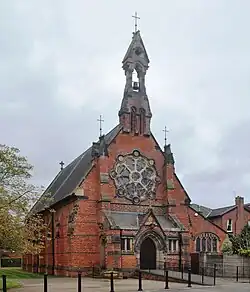 The church is constructed in red brick with blue brick bands, sandstone dressings, and a slate roof. The original building was in Early English style, and the south aisle is Perpendicular. The plan of the church consists of a six-bay nave, a south aisle, a chancel, and a west narthex. On the west gable is a bellcote surmounted by a finial. Along the sides of the church the bays are separated by buttresses. On the north side each bay contains a narrow lancet window, and along the south aisle the windows are Perpendicular. At the west end, the narthex has a lean-to roof, and contains a gabled doorway approached by three steps and flanked by two rectangular windows. Above the narthex is a large rose window. The chancel also has a large east rose window, and there are three lancet windows on each side. Around the chancel is a chequered frieze.[1][2]