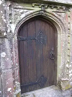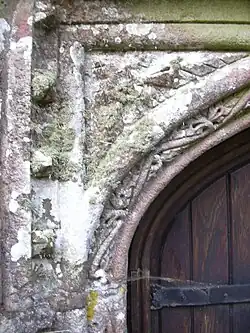 The chief entrance is a south-facing porch with an inner and outer arch. The outer arch is ornamented with cable moulding and foliage. On one of the spandrels of the inner arch, which is made of Caen stone, is the monogram i h c, while on another can be found an encircled Greek cross.[6] An arched west doorway includes carved moulding and carved heads are used as label stops. A priest's doorway to the right of the stair projection is small and rounded.[1] The arcades are characterized by granite arches supported on granite pillars.[6]