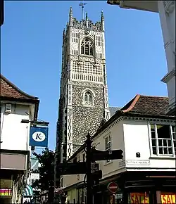 St Lawrence was built on Dial Lane in the heart of present-day Ipswich. The upper section of the tower was rebuilt in 1882 by the London firm of Barnes and Gaye. The new Victorian design consists of floral and geometric flintwork patterns and includes the initials S. and L. Unusually, the modifications also removed the central aisle from the nave in an attempt to prevent celebration of the High Anglican liturgy. It served as a parish church until the early 1970s, when the parish was declared redundant by the diocese due to its having no members.