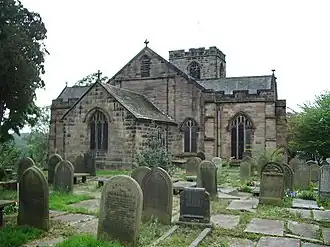 The wide nave has two bays and double transepts.[4] They were constructed from the material (local Hoghton stone) of the same parts that were replaced in the early 20th century.[2] Like the tower, the nave and transepts are buttressed and have crenellated parapets.[4] The chancel is lower than the rest of the building and is plain, without buttresses or crenellations.[1][2] It has a moulded, chamfered plinth.[4] There is a priest's door on the south side.[4]