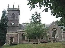 In the churchyard is the base of a medieval cross dating from around 1298 or later. It is in red sandstone and consists of a two-step base on top of which is a bevelled block. This holds a short Tuscan column on the top of which are the fixings for a sundial. It is listed at Grade II,[5] and is a scheduled monument.[6]