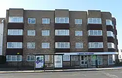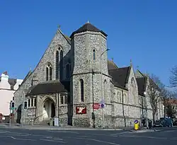 Queen's Park was laid out as an ornamental park of 15.3 acres (6.2 ha) in 1824. Charles Barry was hired to design decorative entrances and a villa for the park's owner.[1][2] Housing development around the park had started in the 1810s and continued throughout the 19th century.[1] The first Anglican place of worship in the area was built in 1875 and became a chapel of ease to St Mary's Church in Kemptown when that church was completed. The red-brick building was on the west side of Queen's Park Road.[1][3] In 1880 a separate parish was established, and preparatory work on the new church started the following year on the opposite side of the road.[3] The site was bought for £900; the foundation stone was laid in 1882 by the Bishop of Chichester, Richard Durnford;[4] and Arthur Blomfield finished the church in 1885, apart from a proposed spire which was never built because of a lack of money.[1] The new St Luke's Church was consecrated on 16 April 1885.[4] The 1875 building held services until then;[1] it then became the church hall until it was gutted by fire and demolished in the 1970s, after which flats were built on the site.[1][3]