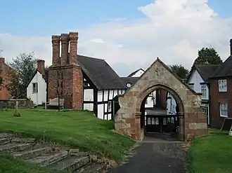At the entrance to the churchyard is a lychgate dating from about 1870. It is constructed in sandstone, has a tile roof, and is in Decorated style. It is approached by six steps from the east, and at the eastern entrance is a pair of wooden gates. Inside the lychgate are stone benches. It is listed at Grade II.[8] Outside the east end of the church is the granite parish war memorial cross which lists local dead from both world wars and one from the Palestine campaign of 1948. It stands in a large area paved with old gravestones moved from elsewhere in the churchyard.[5]