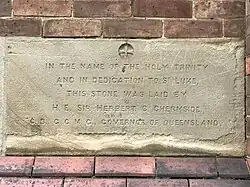 The site was purchased in 1903 by the Church of England for a new mission church. Prior to this, the mission had rented rooms throughout Brisbane and St Luke's provided its first permanent home. On 3 February 1904 the foundation stone of St Luke's Church was laid by His Excellency, Sir Herbert Chermside, Governor of Queensland.[1][2]