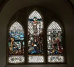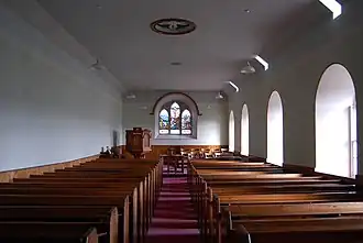 The church has a plain interior, its only adornment an early 20th-century, three-panel stained glass window, decorated with images of the Crucifixion and the life of St Magnus. In the north and south walls are remnants of the earlier medieval church.[3] These include a narrow blocked round-arched door, a small, blocked lancet window in the north wall, and another blocked lancet window in the south wall.[1][2] There is also a late medieval font, made of red sandstone. The font's octagonal bowl is inscribed with a coat of arms. The graveyard surrounding the church contains several gravestones dating to the mid and late 18th century.[1]