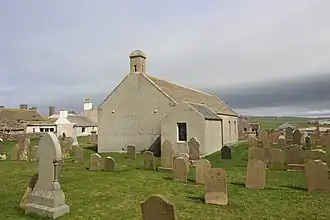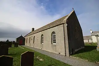 St Magnus's Church is located in the village of Birsay in the northwest area of Mainland, Orkney in Scotland. It is a rectangular building with a harled exterior, round-headed windows and gabled ends. The western gable contains an original birdcage style belfry. The church has a small southwest porch, possibly dating from the 1867 remodel.[1][2]