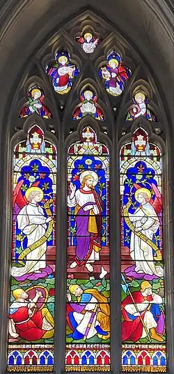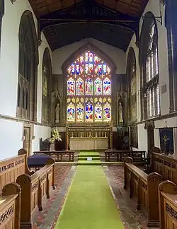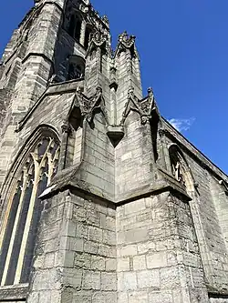 Reconstructed at least four times in its history, most notably in the 15th century, the present structure was described by the antiquarians John Leyland and John Nichols as "the fairest parish church in Leicester"[5] while Nicholas Pevsner noted that its vaulted double height south porch and the towers stair turret are both unique in Leicestershire.[6] Today, thanks both to its monumental perpendicular tower and its location opposite Leicester's busiest bus station, it is one of the city's most recognisable historic structures. It is also noted across Leicestershire and the wider East Midlands for its large peal of 14 bells, ten of which have been in the tower since the 17th century.[5] It is a Grade I Listed Building[7] and a member of the Major Churches Network.