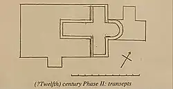 It is possible that at least a south aisle, and possibly a north one too, were added sometime during the later 1100s. This would explain the odd double capital of the transept pillars in the easternmost bay of the nave, where the originally shorter south arcade was heightened during later 13th century reconstructions. The northern arcades parallel moulding is clearly a careful imitation of the southern pier by later builders.[16]