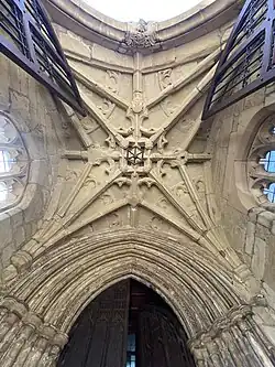 Sometime in the early the aisles were widened out to the ends of the 12th century transepts, their current width.[11] The south door and the south arcades of the nave date to this period. It is also considered that the jambs of the south door and the door itself, including its sanctuary knocker, date to this phase of construction.[16] The excavated well at the east end of the north aisle also dates to this period and was probable used during the construction process. This theory is founded on the fact that the refuse used to fill in the well dates to the early 13th century.[16] The arcade of the south aisle bears a number of remarkable naturalistic decorative carvings most likely dating to this stage of construction. Appropriate to the status of the south aisle as a Lady Chapel, a dedication that continues until today, these are carvings of lily's and roses, motifs associated with the Blessed Virgin Mary who is often referred to by the title Rosa Mystica.[16]