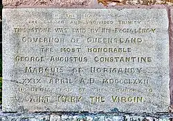 The cornerstone of the present church was laid on 30 April 1872 by the Queensland Governor George Phipps, 2nd Marquess of Normanby in the presence of the Anglican Bishop of Brisbane Edward Tufnell. The stone contains a time capsule containing a bottle with a parchment signed by the Governor, the Bishop and other church dignitaries, a copy of the plans of the church, a copy of the Brisbane Courier and some coins of the realm.[2]