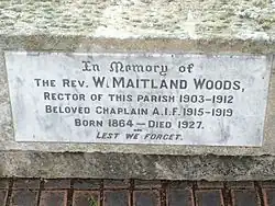 Following the death in 1926 of former rector and World War I army chaplain, the Reverend William Maitland Woods, a bell tower (separate to the church building) was erected to his memory. The belltower is dedicated to Woods on a plaque and by inscriptions engraved on the bells.[9]