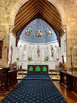 In the interior, the nave is unlined, and timber trusses, resting on small masonry pillars, support the roof. The sanctuary is lined with plaster and its ceiling features three paintings by the noted artist R. Godfrey Rivers.[1]